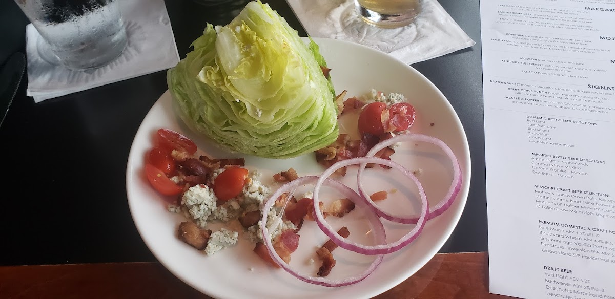 iceberg lettuce topped with crumbled gorgonzola, grape tomatoes, bacon and bleu cheese dressing